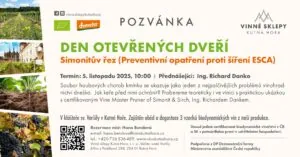 Poslední letošní Den otevřených dveří na téma Simonitův řez a jeho funkce jako preventivní opatření proti šíření ESCA s Ing. Richardem Dankem, Vine Master Pruner of Simonit & Sirch a nezávislým révologem se přesouvá na 5.11.2025. Workshop se bude skládat z teoretické i praktické části ve vinici, kde si účastníci teoretické vědomosti vyzkouší v praxi přímo na keřích révy vinné. Hlavní dovedností, kterou by si vinohradníci měli z workshopu odnést, je schopnost budovat strukturu révového keře dlouhodobě bez velkých řezných ran a zamezit tak průniku dřevokazných hub do rostliny.